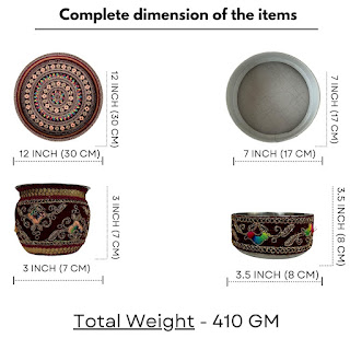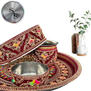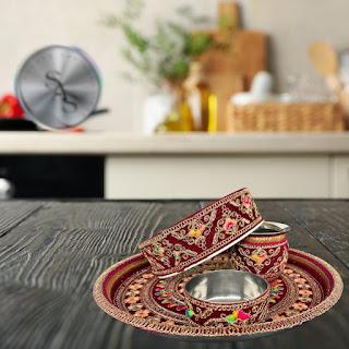 Over time, the designs of Karwachauth Thali Set have evolved. While traditional sets are decorated with embroidery, meenakari, or mirror work, modern thalis include metallic finishes, glass decorations, and even personalized names or initials.